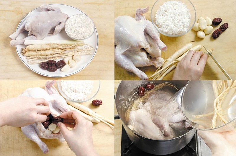 Gà hầm sâm được làm từ những nguyên liệu đa dạng như: con gà, gạo nếp, nhân sâm, táo đỏ, tỏi và gừng. Sau khi nhồi các nguyên liệu kể trên vào bụng gà, gà sẽ được cột lại bằng dây và hầm với nước canh trong vòng 40-45 phút tới khi thấy nước soup có màu trắng là được. Món gà hầm sâm được phục vụ trong chiếc nồi nhỏ, phục vụ bưng ra còn nóng sôi sùng sục luôn. Theo mình được biết hương vị độc đáo và mùi vị của món canh phụ thuộc vào các loại nguyên liệu khác nhau được kết hợp sử dụng ra sao, thông thường gà hầm sâm thường ăn kèm với kim chi cải bắp, ớt, kim chi củ cải trắng, muối và tiêu được đặt trong một đĩa nhỏ riêng để chấm thịt.