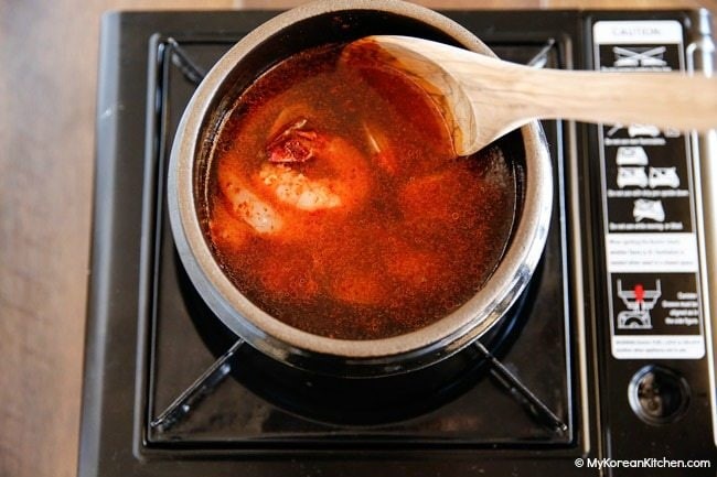 + Cho thêm nước dùng cá cơm tảo bẹ vào, đun ở nhiệt độ cao cho đến khi nước dùng sôi (2-3 phút). Nước dùng này bạn có thể tự nấu chuẩn bị trước, mua tại cửa hàng các túi lọc nước dùng sẽ giúp món canh ngon hơn. Nếu không có nước dùng thì thay thế bằng nước lọc nhé.
